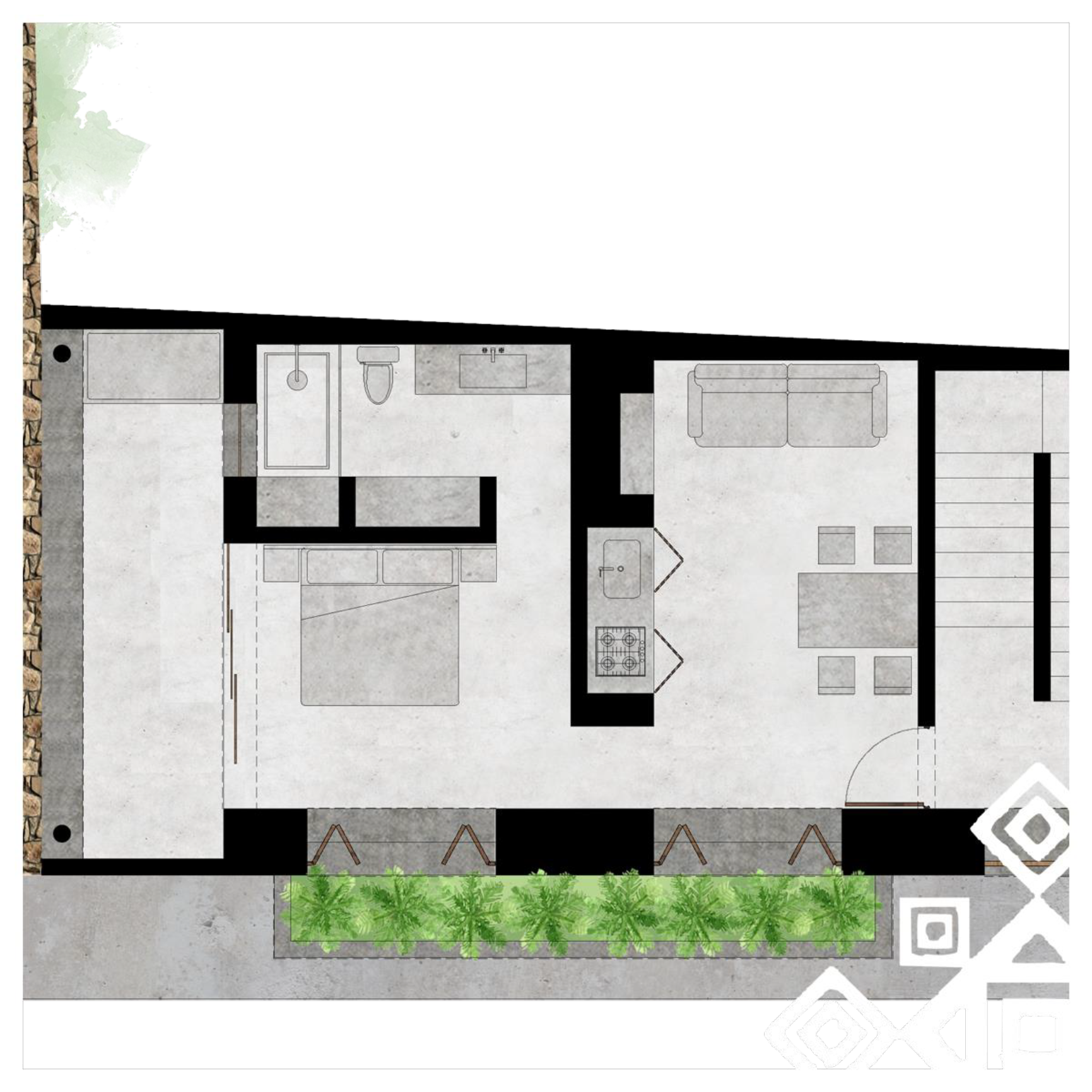 Amplia y versátil suite que integra sala de estar, comedor y una ingeniosa cocina oculta. Ideal para familias pequeñas o grupos de amigos que desean confort y funcionalidad. La Fire Suite es un espacio generoso de 79.35 m² que combina inteligentemente la funcionalidad con el estilo. Su diseño de concepto abierto incluye una cómoda sala de estar con un sofá-cama, un área de comedor y una cocina completamente equipada que puede ocultarse ingeniosamente cuando no está en uso, manteniendo la estética limpia del espacio. El dormitorio principal cuenta con una lujosa cama King Size. El baño es completo y moderno. La suite se abre a una espaciosa terraza con una banca lounge, perfecta para disfrutar de comidas al aire libre o relajarse al atardecer, además de un balcón con vegetación que añade un toque de frescura. Un nicho decorativo añade un detalle de diseño único. Esta suite es ideal para familias pequeñas o grupos de amigos que buscan un espacio amplio, cómodo y lleno de estilo para su estancia en WIXRK.